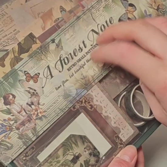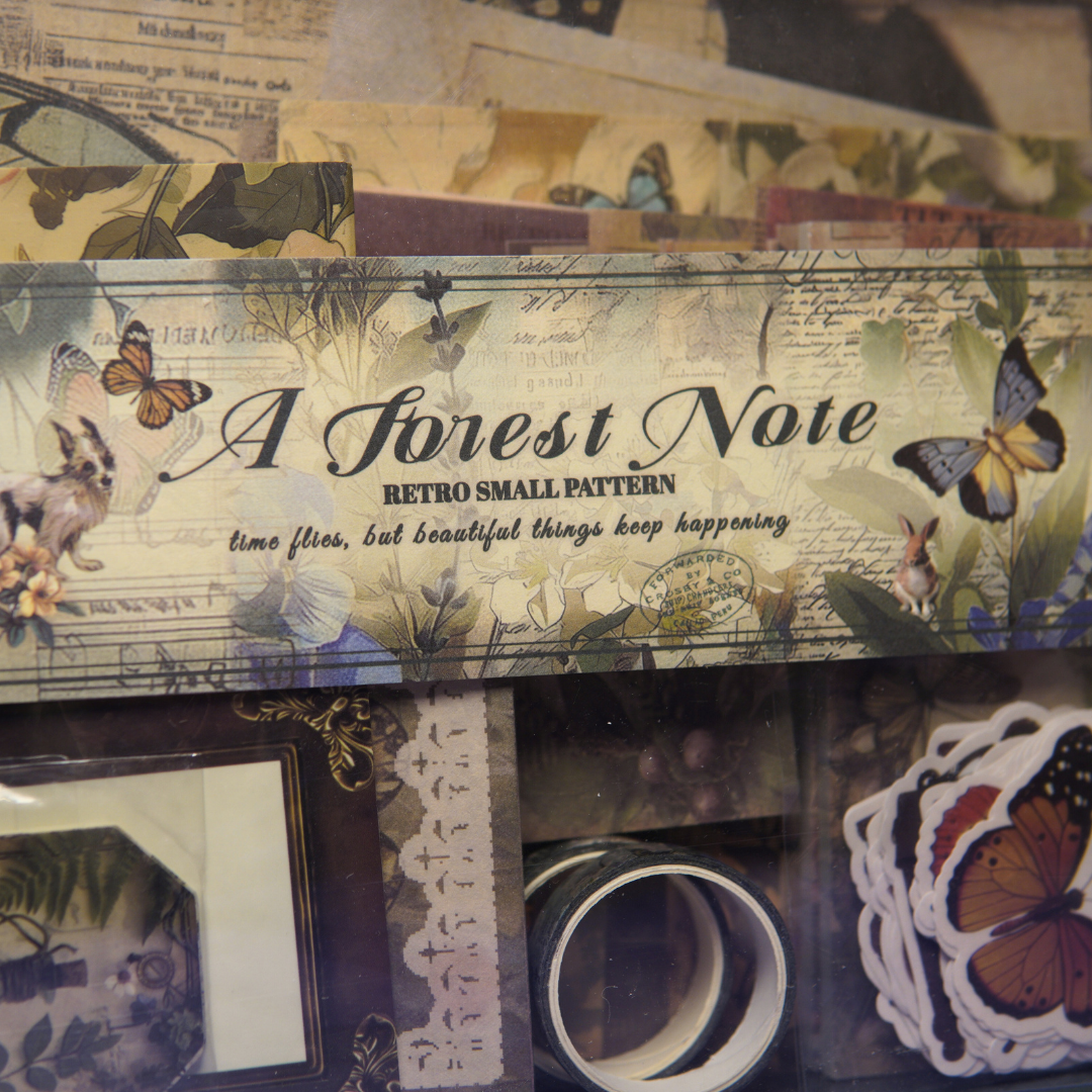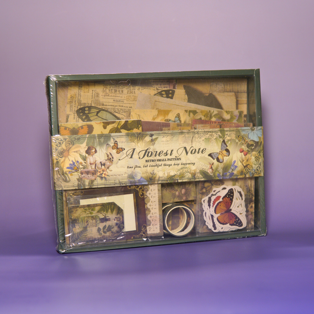 Duik in de betoverende wereld van bosachtige illustraties, vlinders, botanische prints en nostalgische retro-elementen met de A Forest Note Stationery Set. Deze uitgebreide creatieve set is speciaal samengesteld voor iedereen die houdt van journaling, scrapbooking, collage-kunst of het decoreren van planners en fotoalbums.